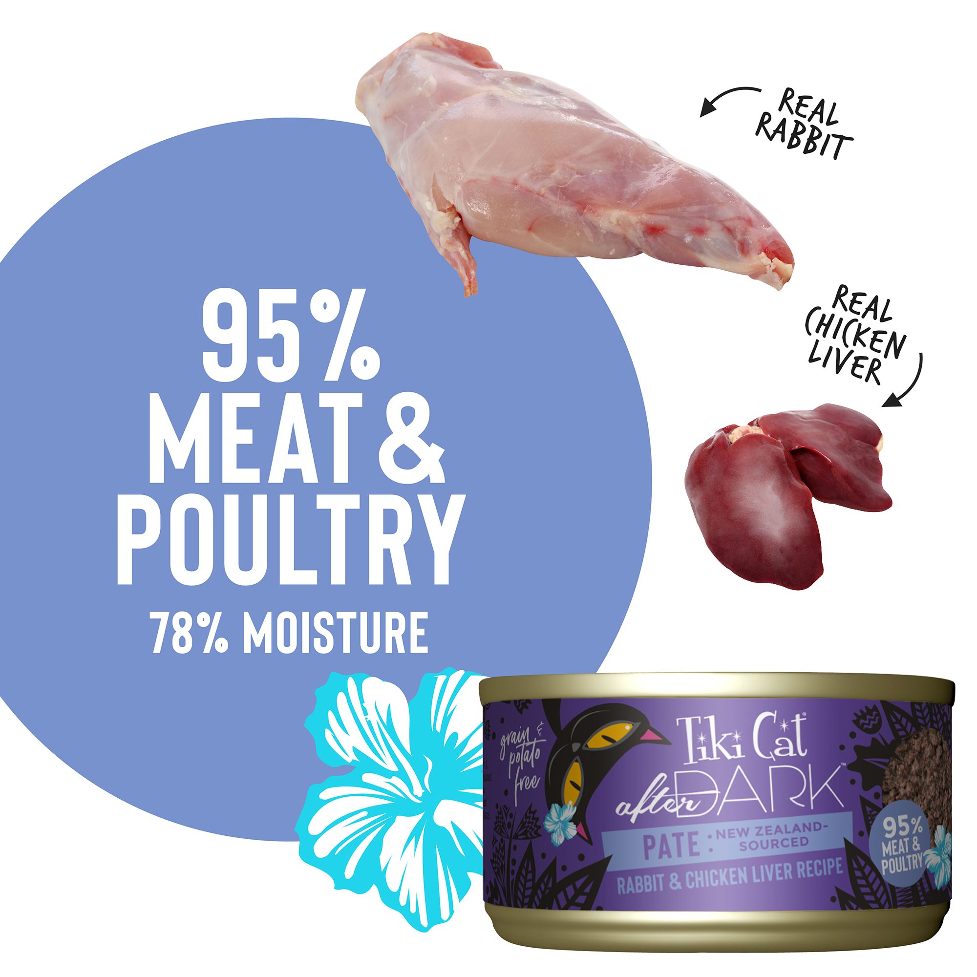 Tiki cat after dark rabbit pate cat food can 3oz 239. Home Tiki Cat After Dark A Meat-Lovers Dream The meat cats crave. Give cats the real meat and poultry they crave with New Zealand-sourced rabbit duck and chicken liver in a soft finely ground pâté.